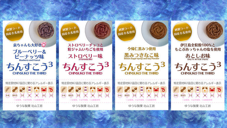 ちんすこう(2個x3袋)の、「ブルーベリーとピーナッツ味」「ストロベリー味」「黒みつきなこ味」「あとしお味」の商品ラベルを変更いたしました。