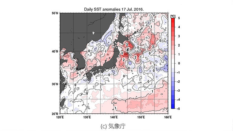 まずは、2016年7月17日と1年前の2015年7月17日の海水温の比較です。大きな違いとしては2016年には30℃線が地図上に現れているのと、日本海側に温度の高い海水が入り始めています。